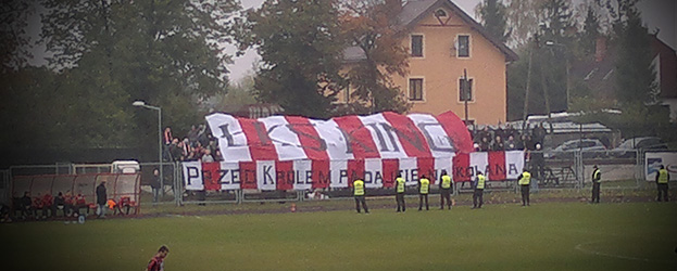 Motto wyjazdu zostało zaprezentowane w postaci sektorówki, którą uzupełniał transparent na płocie ” Przed Królem padajcie na kolana”. Od początku ruszyliśmy z dość głośnym dopingiem, nie zapominając także o „pozdrowieniach” dla naszych rywali oraz ich „wielkiej siostry” z Białegostoku. Ogólnie nie marnowaliśmy gardeł na gospodarzy odsyłając ich zaczepki jednakową głośną ripostą i skupiliśmy się na dopingu dla naszych zawodników, którzy niestety nie podołali w tym meczu.