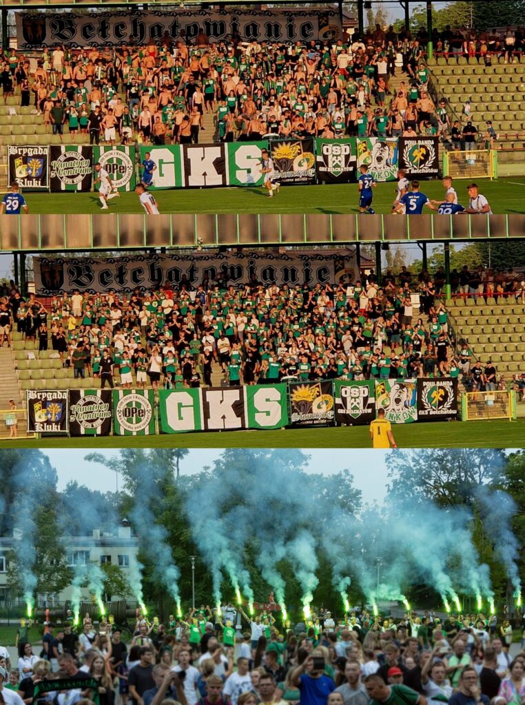 Relacja kibiców gospodarzy: „Zbieramy się w nieco ponad 40 osób. Na płocie 3 flagi. Cieszy widok młodych na meczach, ale stać nas na znacznie lepsze liczby. Widzimy się już 16 września o 15:00 na meczu z GKS Bełchatów, nie może nikogo zabraknąć na tym meczu.”