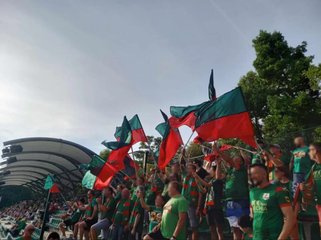 Podróż spokojna z jednym postojem, pod stadion podjeżdżamy wraz z rozpoczęciem meczu. Organizatorzy wcześniej nalegali na wysłanie listy imiennej, oznajmiając, że bez niej sektor gości będzie zamknięty, jednak na miejscu okazało się, że mimo braku listy nie ma żadnych problemów. Kupujemy bilety w kasie i wchodzimy na sektor, a na dodatek dostajemy od organizatorów… pudło pełne bananów od tajemniczego sponsora. Rozwieszamy na płocie „Eskapadę” i zaczynamy doping. Tuż obok nas swój młyn mieli miejscowi kibice, których nastawienie do nas było całkiem pozytywne. Zero bluzgów czy spin, a nawet podrzucili nam wodę do sektora (dzięki!). Ich młyn liczył kilkadziesiąt osób (głównie młodzież, ale też paru starszych kiboli) i śpiewali cały mecz. Nie można tego samego niestety powiedzieć o nas – o ile I połowa w większości upłynęła pod znakiem śpiewów w asyście bębna, o tyle po przerwie mieliśmy stanowczo zbyt dużo przestojów. Po pierwszym przegranym meczu w tym sezonie dziękujemy piłkarzom za walkę, po czym wbijamy do naszych środków transportu i błyskawicznie ruszamy w drogę powrotną. Podróż trwała niecałe 2 godziny i bez przygód meldujemy się w Brunatnej Stolicy.”