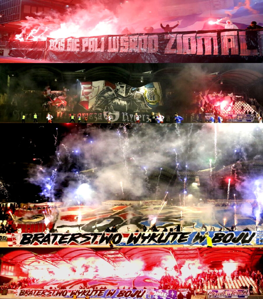 Na początek meczu prezentujemy pirofolię „Dziś się pali wśród ziomali”, podświetloną przy pomocy ogni wrocławskich, stroboskopów oraz rac. W drugiej połowie po raz pierwszy w naszej historii decydujemy się na podwieszaną oprawę – rycerza na tle proporców w barwach obydwu klubów. Na płocie ląduje transparent z przydomkami obydwu ekip, nawiązującymi do historycznych korzeni naszych miast „Strażnicy Mazowsza” i „Rycerze Warmii”. Efekt? Zapraszamy do oceny. Mecz kończymy oprawą przygotowaną przez naszych układowiczów, a przy jej prezentacji zaczyna się prawdziwy sylwester.